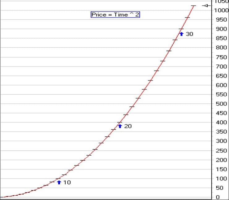 Let me take this mathematical relationship and develop it in this article. The above relationship between price and time can be plotted on a chart as shown in this illustration. The time values of 10, 20, and 30 are marked by the three arrows. See Figure 1.