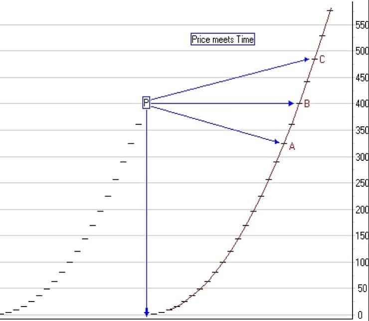 With the prominent top or bottom at P, if price meets the curve at point A it will do so in 18 bars. The time to A is the square root of the price at A. Price at A is 324. Square root of 324 is 18. If price meets the curve at point B, it will do so in 20 bars. The time to B is the square root of the price at B. Price at B is 400, therefore the time to B is 20 bars. If price meets the curve at point C, it will do so in 22 bars. This is a very interesting concept!