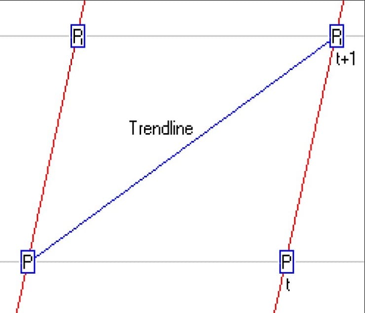 In this article, I will develop the mathematics for the slope of a trend line using the price and time relationship presented in the previous article. Let’s work with the model illustrated in this See Figure 3. From the previous article, the next time curve will be t bars away for a given price P. At a time t+1 price would meet the curve at price P1. Now, lets solve for the slope of the trend line shown in blue which connects P and P1.