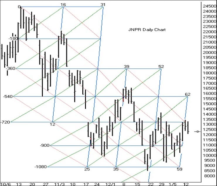The price at the 12 to 16 time line was used to obtain a forecast of the 2nd time line, which is labeled 25 to 31. As the price meets each time curve, a new time curve is calculated based on the price. Each of the time curves shows excellent correlation with market change when price met the time line. Prices: The prominent high of $24.50 is the calculation basis for all the horizontal price levels that are shown. Tip: The market seeks out these price levels, and you can calculate these prices in advance. Note how the market fell to the -540 horizontal, rallied to the -180 horizontal, fell to the -900 level, rallied to the -540 level, fell to the -1080 level, and rallied to the -720 level.